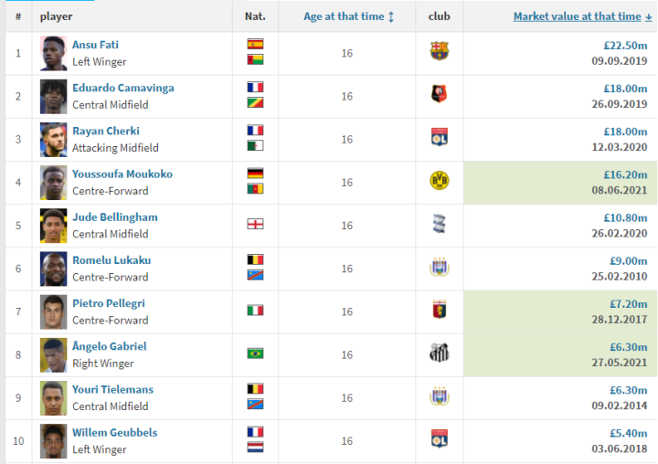 小帆的体育世界接下来的一段时间,将会给大家带来世界足坛各年龄段的身价记录,这里的年纪以球员的周岁为计算规则,记录各位球员在达到相应年龄前的身价情况,并且进行排序,今天一起来看一下17周岁以下的球员身价排名情况吧。