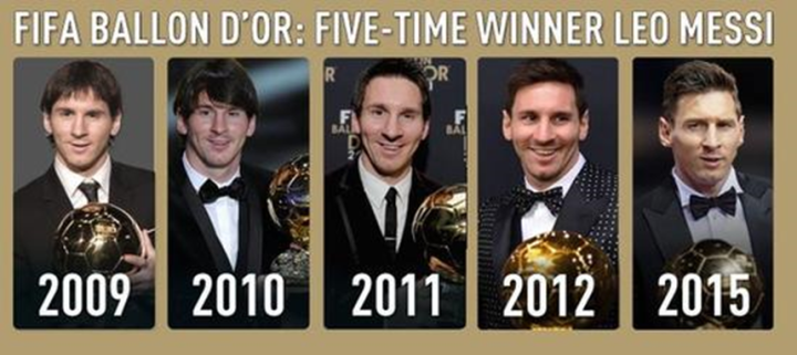 2016年1月12日,梅西从2007年金球奖得主卡卡手中接过他的第5座金球奖,成为了史上第一位达到此成就的球员。