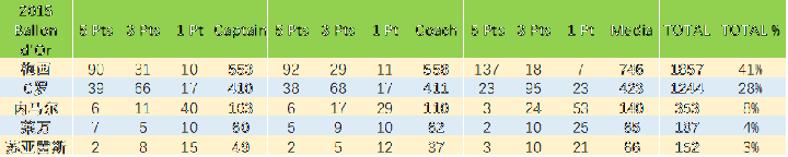 注1:金球奖(Ballon d’Or),是由法国杂志《法国足球》于1956年设立评选欧洲最佳球员的奖项,1994年之前评选对象仅为欧洲球员,1995年开始扩大为在欧洲效力的球员,2007年在此扩大为全球所有球员。金球奖虽然是非官方的评选,却因为其悠久的历史,严格的评选标准,逐渐成为足球界的最高个人奖项,金球奖也成为了足球运动员的终极梦想。金球奖的评选规则为欧足联成员国和参加过世界杯国家的记者进行投票。2010年7月5日,FIFA与《法国足球》达成协议,《法国足球》以1500万欧元的价格将金球奖评选的主办权利转让给FIFA, 自此FIFA世界足球先生奖项与金球奖合并,改名为 “FIFA金球奖”,评选规则也改为FIFA所有成员国的记者、教练、队长投票,各占三分之一。2016年金球奖回到法国足球,评选规则改为全球国家的媒体记者投票。