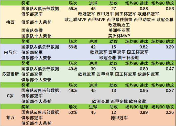 注3:本文所有球员的荣誉资料来自于Wikipedia,所有球员的数据资料来自于Transfer Market。Transfer Market是将造乌龙,打门被扑队友补射等算入助攻数据的,所以助攻数据可能和某些机构略有不同。