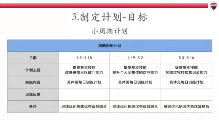 12月16日上午,中国足球协会线上《青训大纲实践分享会》第一期课程成功举办,深圳市足球俱乐部U16梯队主教练陈涛以自身执教经历为切入点,分享了如何利用《中国足协青少年足球训练大纲》(以下简称“《青训大纲》”)指导工作。他从目标、评估-比赛、制定计划、实施计划、比赛检验、总结-计划等六个方面进行阐述。
