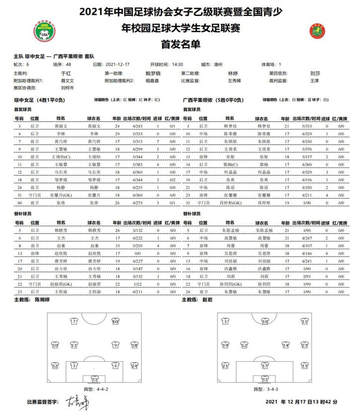 (资料据自、鸣谢:广西平果呗侬女足、广西师范大学女足、广西体育局、广西平果哈嘹足球俱乐部、长春大众卓越女足俱乐部、中国女足官微、CUFA官微、耀素材、我是球星、小球迷、黄智,整理编辑:耀武酒肆工作室、同道南方)