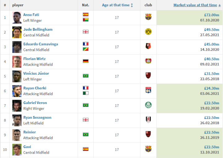 小帆的体育世界上篇我们介绍了17周岁以下年龄段身价最高的球员,巴萨的法蒂、雷恩的卡马温加以里昂的切尔基占据前三,而到了18周岁以下的年龄段,名次发生了比较大的变化,法蒂依然占据第一,切尔基降至第六,而贝林厄姆转会多特后身价暴涨,来到第二名,下面一起来看下具体排名吧。