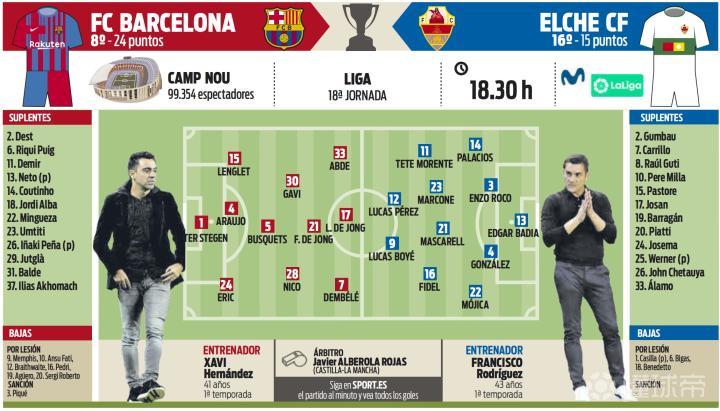 巴萨vs埃尔切首发预测当地时间今日下午6点半,巴...