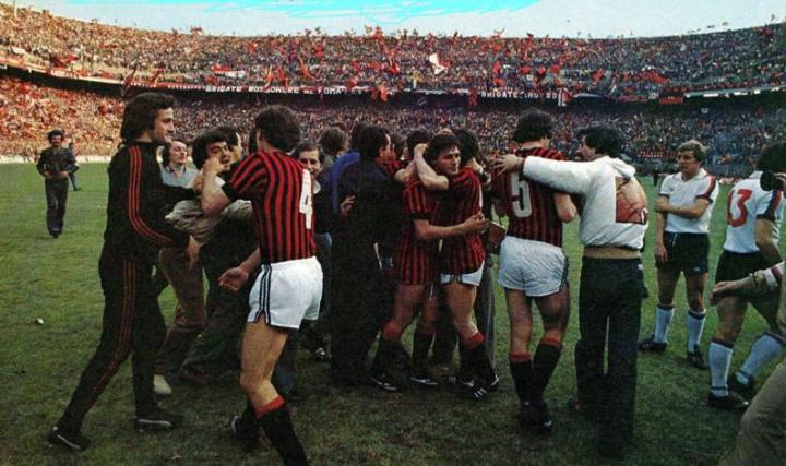 1979年5月6日是米兰俱乐部历史上最伟大的日子,也就是联赛第29轮(倒数第二轮),米兰在主场0-0战平博洛尼亚队,时隔11年,重夺意甲联赛的冠军,也是第10次获得意大利全国冠军。米兰今后的球衣上,就可以有一颗星了!图为赛后,米兰球员相拥庆祝。