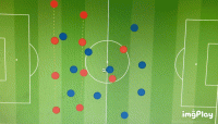 (GIF)可以看到在对方球员像前场球员传递时,萨基的4-4-2体系便可以通过两条防线的整体移动与局部区域的多打少造成人数上优势,从而迫使对手选择横向/向后传球。