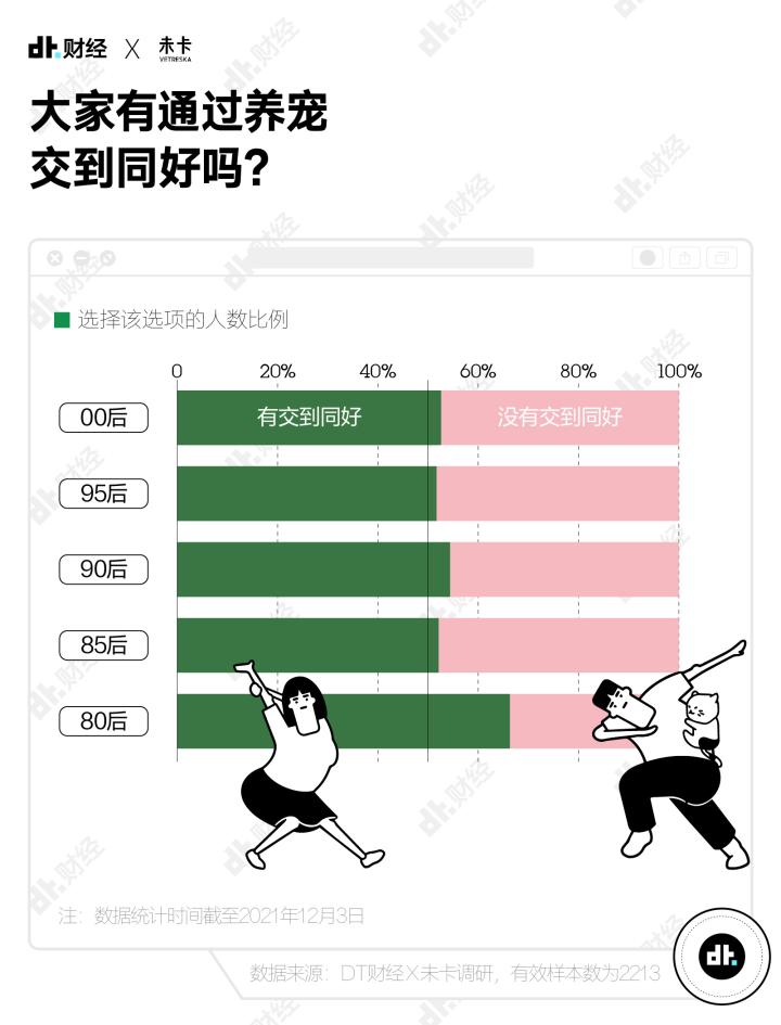 在我们的调研中,各年龄段都有超过半数人通过宠物交到同好。其中,80后通过宠物交到同好的比例最高,超过6成。