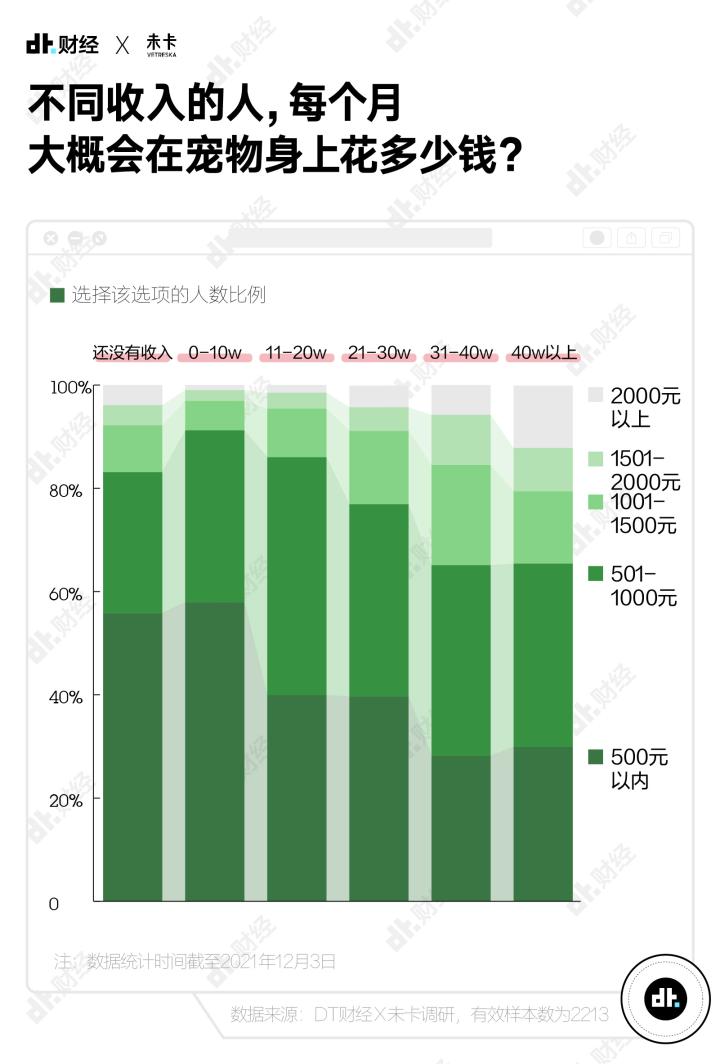 所以我们也不难从数据中发现,尽管大部分人每月为宠物花费的金额在500元或1000元以内,但收入越高,为宠物花更多钱的比例也越高。