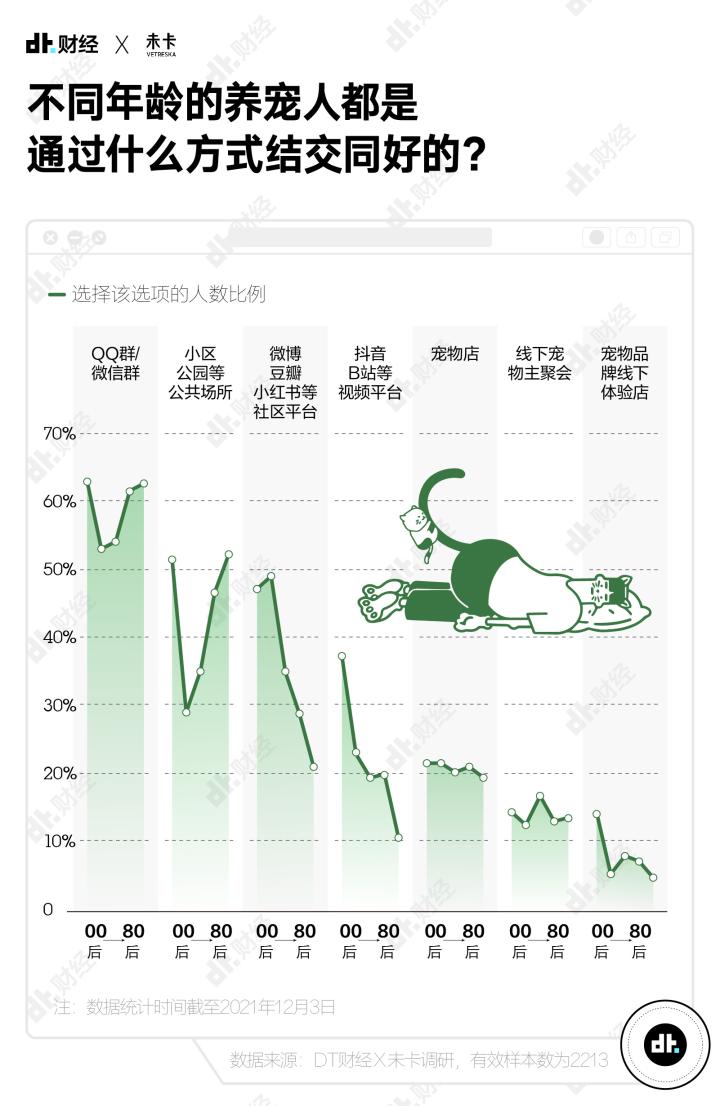 不同年龄,通过宠物交到同好的方式各有不同。00后有更多结交同好的图景,不仅在小区、公园等公共场所结交同好,还偏爱在抖音、B站等视频平台认识朋友。