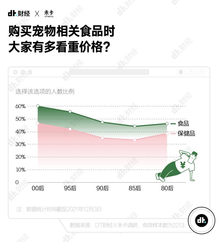 与其他年龄段相比,在购买宠物相关食品时,00后和95后整体会更看重价格。尤其是购买宠物食品(主粮和零食)时,有6成00后都很看重价格。