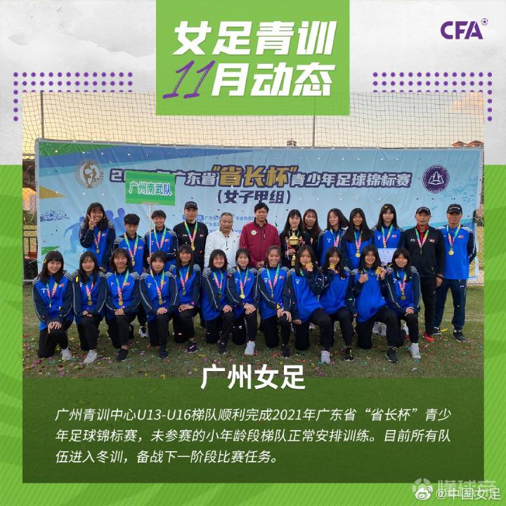 2021年女足青训11月工作动态:广州女足广州青...中国女足 @懂球帝2021-12-20 15:002021年女足青训11月工作动态:广州女足 广州青训中心U13-U16梯队顺利完成2021年广东省“省长杯”青少年足球锦标赛,未参赛的小年龄段梯队正常安排训练。目前所有队伍进入冬训,备战下一阶段比赛任务。展开更多