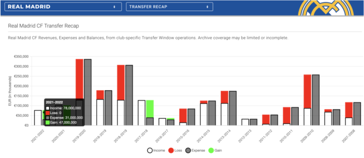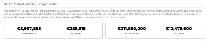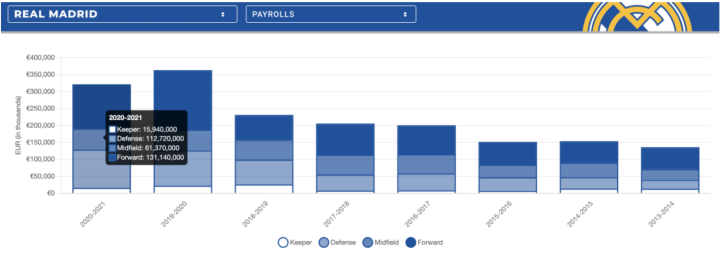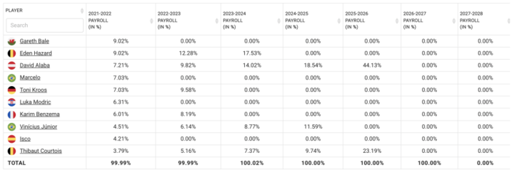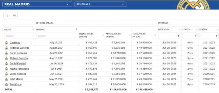 以西甲联赛皇家马德里足球俱乐部为例,在Capology中,可以查看俱乐部: