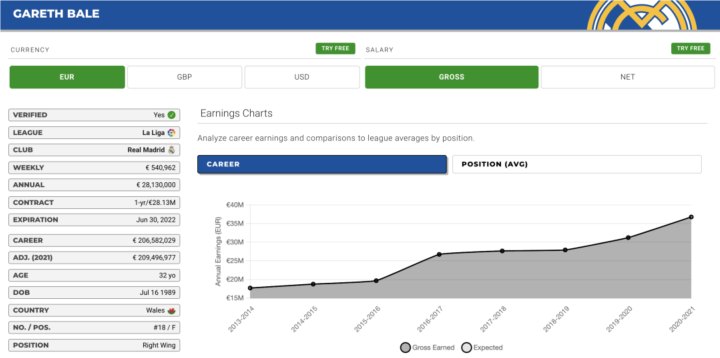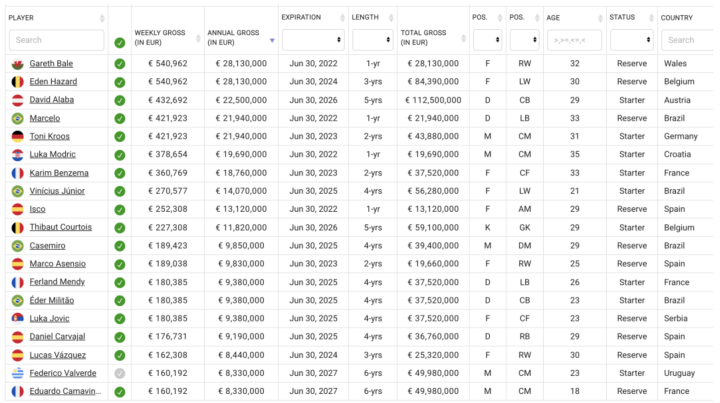 2)Capology依靠直接参与合同谈判的内部人脉网络以及全球范围内发布的信息来呈现数据内容。当这些来源仍然不够时,Capology自主研发的算法将起到辅助作用。数据库中超过30%的现役世界足球运动员的薪资数据已经经过了验证。