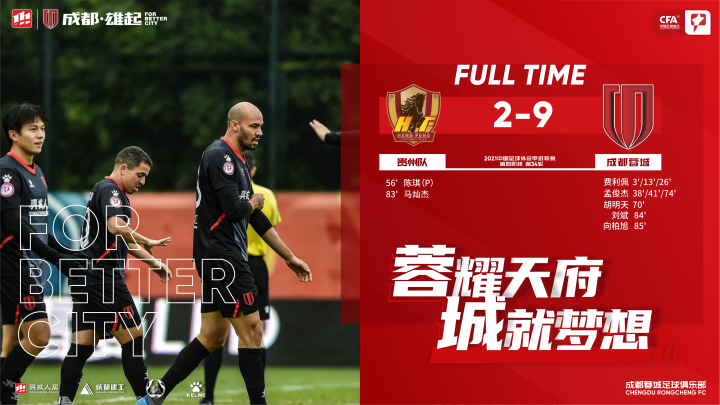 全场比赛结束,成都蓉城9-2贵州队,以一场大胜完...成都蓉城足球俱乐部 @懂球帝2021-12-21 16:50全场比赛结束,成都蓉城9-2贵州队,以一场大胜完成了我们的正式比赛百场里程碑,也用胜利结束了本赛季中甲联赛!接下来,我们将全力备战升级附加赛,为成都足球的梦想,向更高一级的殿堂发起冲击!展开更多