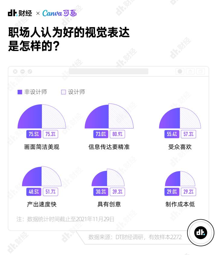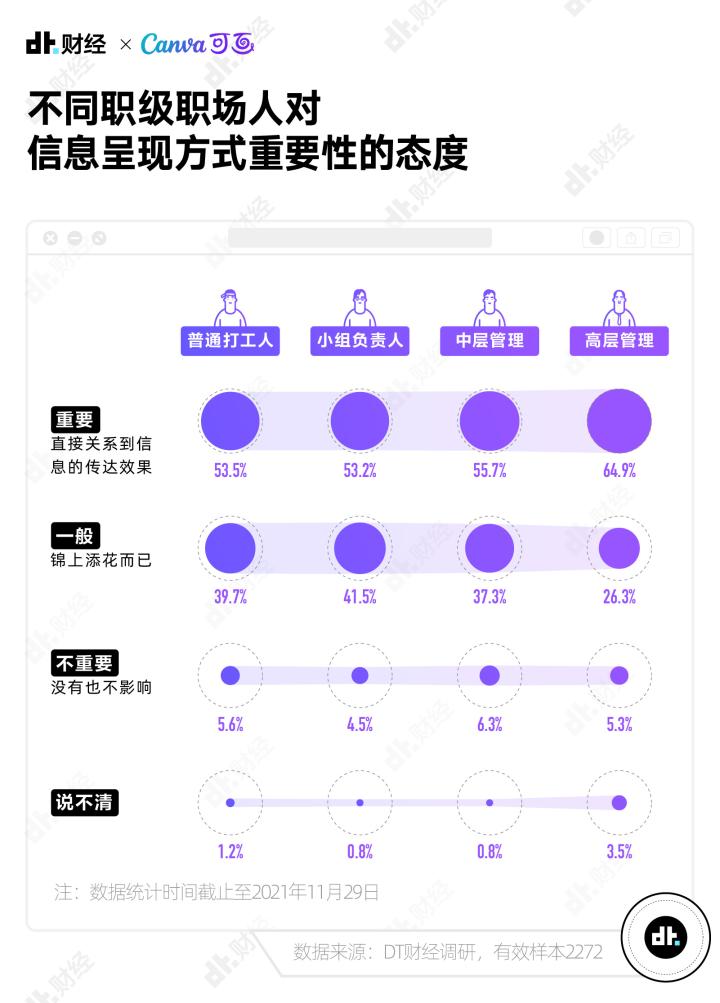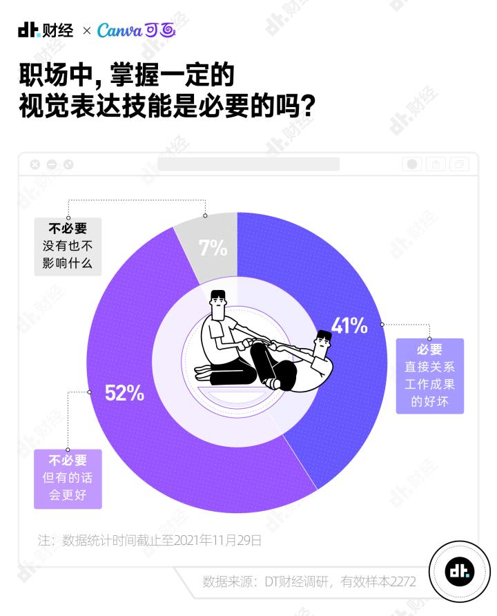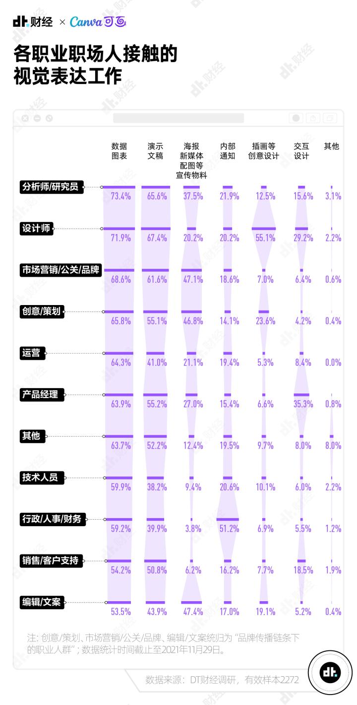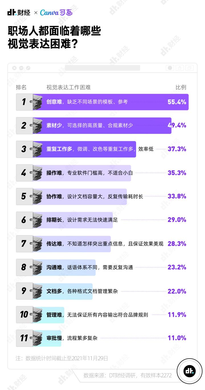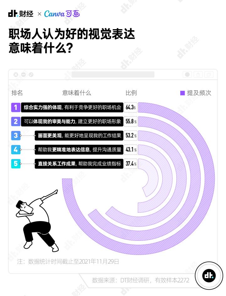 为了搞清楚当代职场人视觉表达的现状和困难,上个月,DT财经联合Canva可画发起“2021打工人视觉素养大调查”,并根据回收到的2272份有效样本发布《视觉,新表达时代的沟通语言——2021新职场趋势调查报告》。