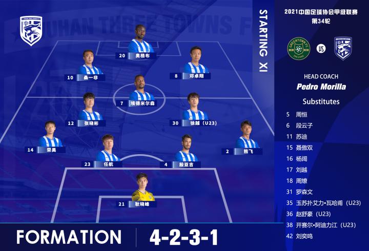 武汉三镇首发阵容及换人:2-熊飞、4-殷亚吉(78′换上5-周恒)、7-埃德米尔森、8-邓卓翔(61′换上11-苏迪)、10-桑一非(61′换上17-刘越)、12-张晓彬、14-荣昊、20-奥格布(71′换上18-周燎)、21-耿晓峰、23-任航、30-徐越(78′换上38-开赛尔•阿迪力江)