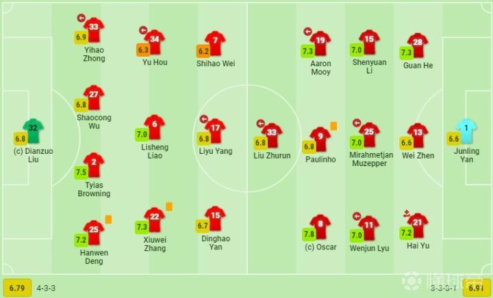 替补:12-陈威、2-李昂、6-蔡慧康、18-张一、20-杨世元、27-张卫、29-聂孟(U23)