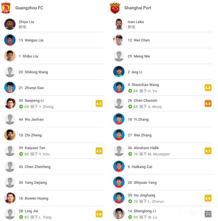 广州首发:32-刘殿座、2-蒋光太、6-廖力生、7-韦世豪、15-严鼎皓(U23)、17-杨立瑜(82'28-凌杰(U23))、22-张修维、25-邓涵文、27-吴少聪(U23)、33-钟义浩(68'35-李学鹏)、34-侯煜(U23)(67'39-谭凯元(U23))