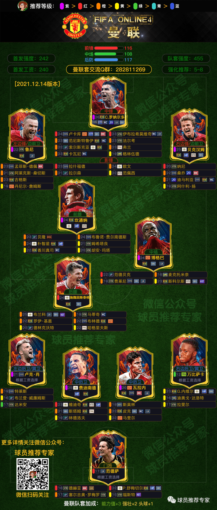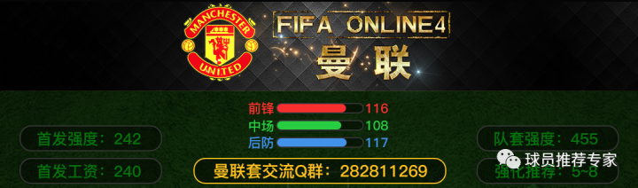 设定紫色12分,红色10分,橙色8分,黄色7分,绿色5分,青色3分,蓝色1分(首发的得分需乘以2)。队套得分为36人大名单的球员的得分(36名球员分别是:首发11人得分+除首发11人外的11个位置前两名+另外3名队内得分最高的球员)。根据规则得出曼联套的首发得分是:242,队套得分是:455。