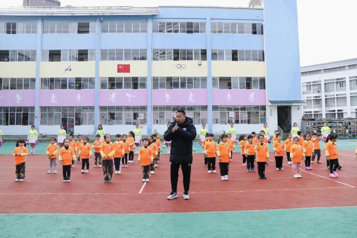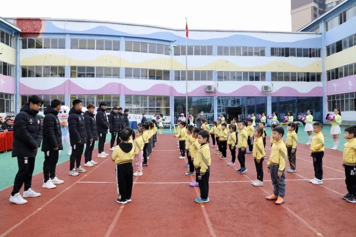 9时整,伴随着激昂的入场曲,小运动员、足球教练依次入场。随后,足球教练为小运动员们赠送球衣。