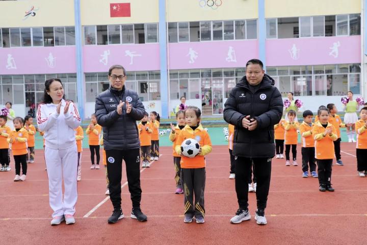 谢育新总教练为小运动员赠送了签名的纪念足球。梁显春校长代表俱乐部向来宾市第一实验幼儿园授予“广西蓝航足球俱乐部幼儿足球启蒙基地”牌匾。