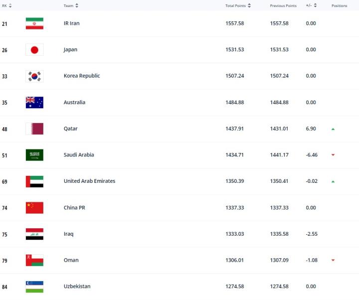 FIFA年终排名:国足第74,比去年同期上升1位;比利时世界第1大波儿 @懂球帝2021-12-23 17:05北京时间12月23日,FIFA官方公布了年终排名:国足排名第74,比去年同期上升1位;比利时继续霸榜。世界排名前十如上图所示,亚洲排名前十的队伍如下(右侧为世界排名序号)——1.伊朗 212.日本 263.韩国 334.澳大利亚 355.卡塔尔 486.沙特阿拉伯 517.阿联酋 698.中国 749.伊拉克 7510.阿曼 79展开更多