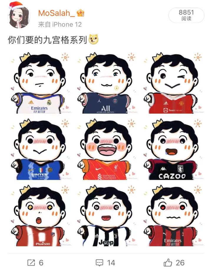 有一次在利物浦群里聊天的时候突然有了灵感,就画出来了。最开始只有利物浦,后来又画了欧冠的对手国米,没想到会火起来了,现在已经更新出一套九宫格。