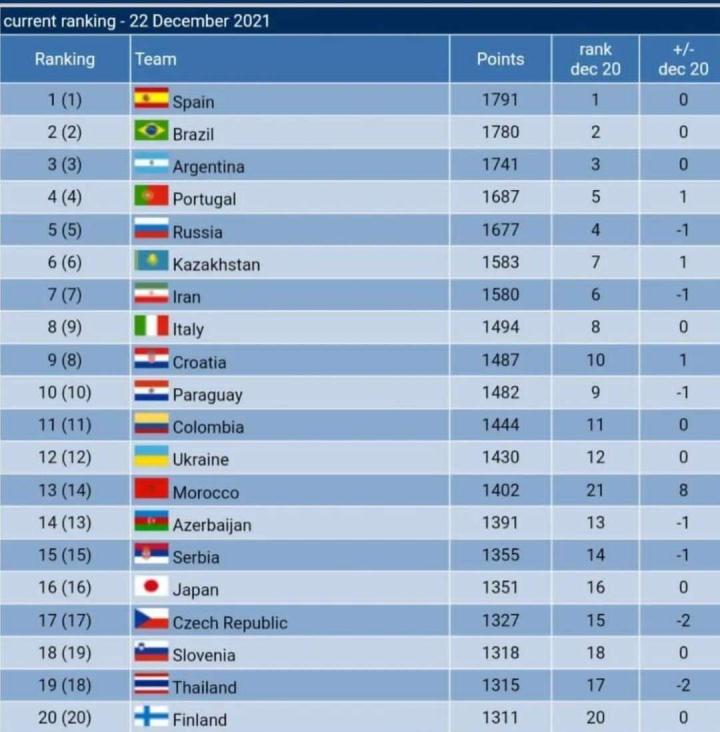 FIFA室内足球年终排名,西班牙位居第一!伊朗世...