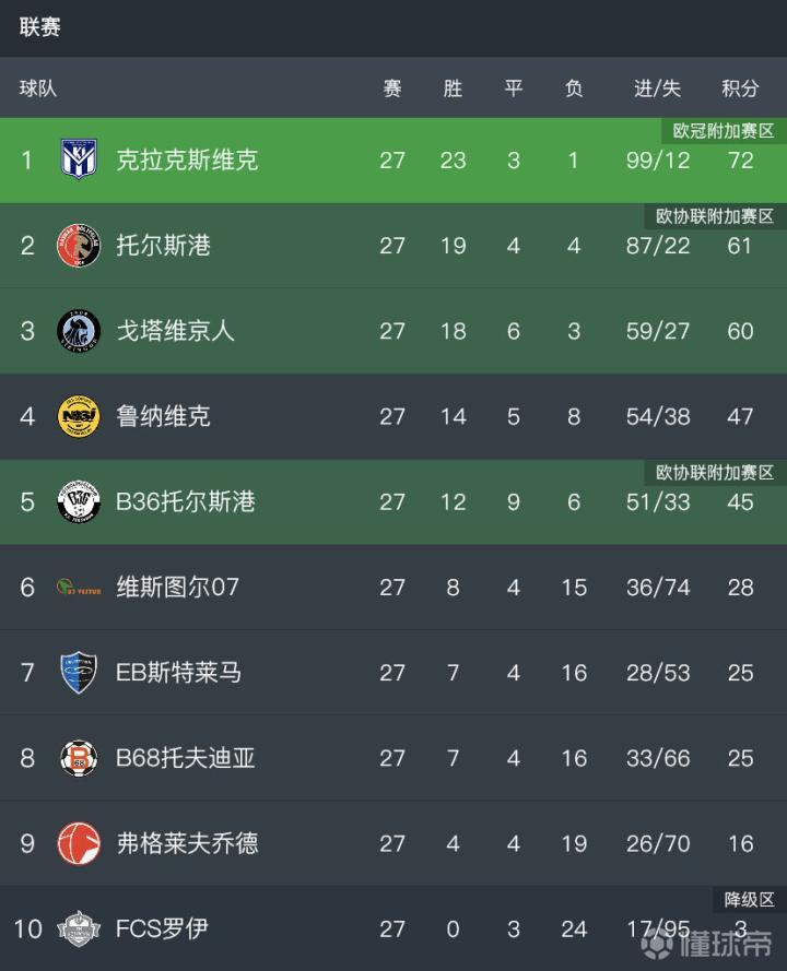 2021赛季法罗群岛足球超级联赛落幕,克拉克斯维克以11分优势,力压联赛霸主托尔斯港获得冠军。 本赛季克拉克斯维克展现了超凡统治力,27场比赛拿下23场,只输1场,打进99球仅丢12球。这也是球队最近3年的第2个联赛冠军,而他们再上次夺冠还要追溯到1999年。 法罗超夺冠排行榜,托尔斯港24冠排名第1,克拉克斯维克19冠排名第2,B36托尔斯港11冠排名第3。 法罗群岛杯决赛,B36托尔斯港击败鲁纳维克获得队史杯赛第7冠,不过他们和6次夺冠的克拉克斯维克都没能赶上托尔斯港28冠的零头。 法罗群岛面积1399平方千米,相当于北京市昌平区大小;人口只有4.8万,还没有天津市考研的人数多;人均GDP4.2万美元,与新西兰相当。 法罗群岛是欧洲最弱的球队之一,从未杀入过大赛决赛圈,最新世界排名第123,处于第118泰国和第126菲律宾之间。 附:近五年联赛冠亚军 2017: 戈塔维京人 克拉克斯维克 2018: 托尔斯港 鲁纳维克 2019: 克拉克斯维克 B36托尔斯港 2020: 托尔斯港 鲁纳维克 2021: 克拉克斯维克 托尔斯港