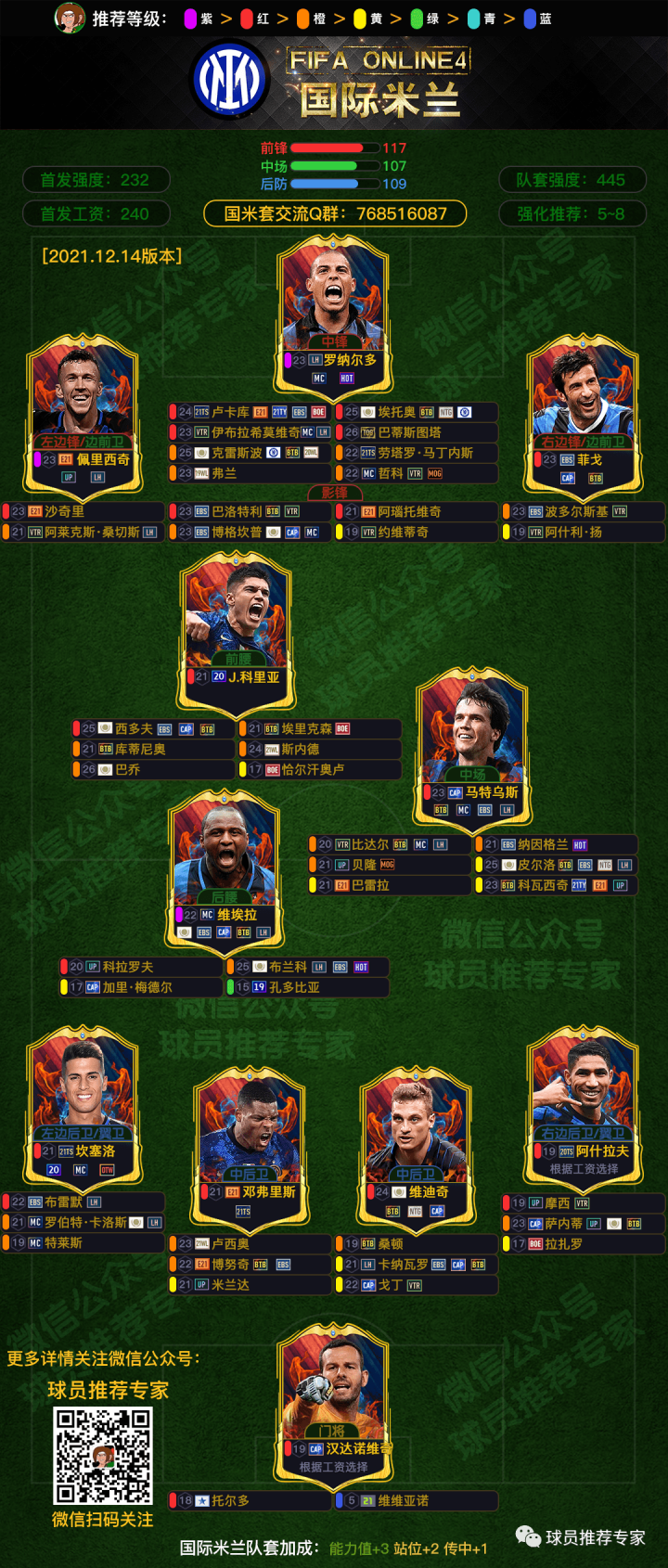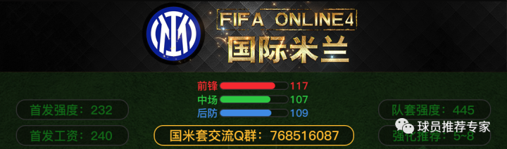 设定紫色12分,红色10分,橙色8分,黄色7分,绿色5分,青色3分,蓝色1分(首发的得分需乘以2)。队套得分为36人大名单的球员的得分(36名球员分别是:首发11人得分+除首发11人外的11个位置前两名+另外3名队内得分最高的球员)。根据规则得出国米套的首发得分是:232,队套得分是:445。