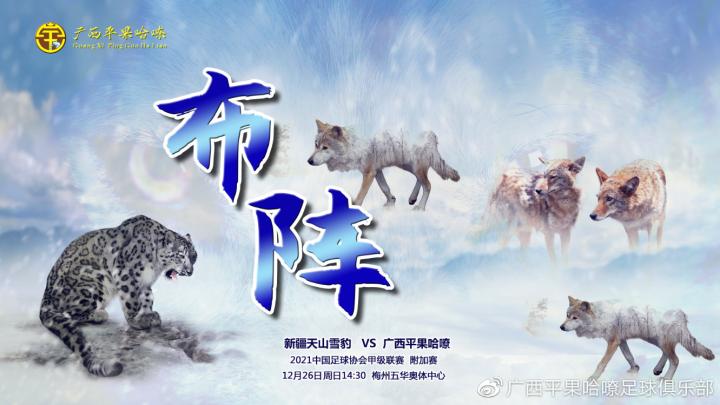 本场比赛我们官方海报的主题是“布阵”,两场附加赛是“群狼”斗“雪豹”,首回合比赛是26日下午14时30分在梅州五华奥体中心举行,希望广大球迷能为广西平果哈嘹队加油!