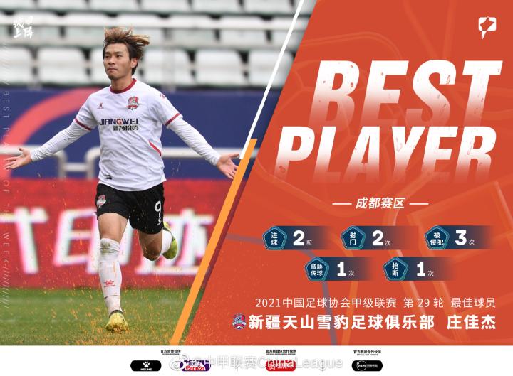 12月20日,2021赛季中甲联赛第34轮收官战,新疆天山雪豹雪藏了他们的队内射手庄佳杰等主力,但全队依然显示不俗实力,仅一球小负排名中甲联赛第七的黑龙江冰城,以第18名的成绩结束了2021赛季的中甲联赛。