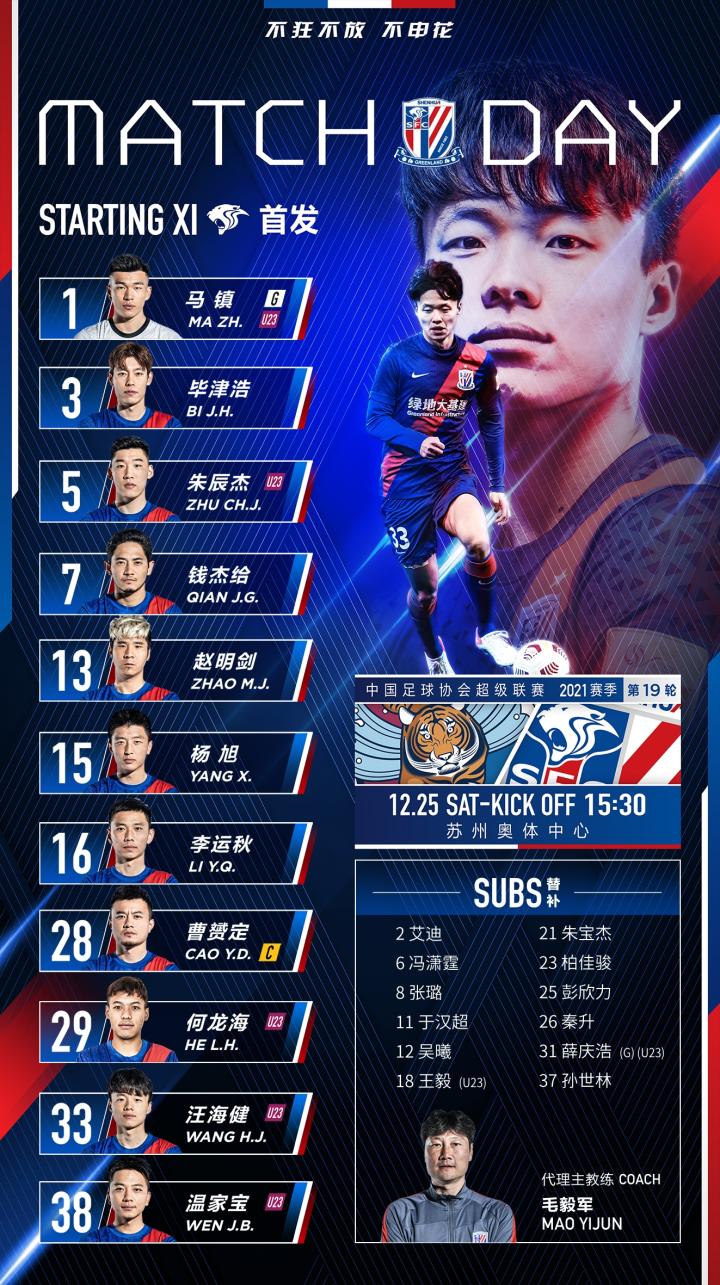 上海申花足球俱乐部北京时间12月25日15:30,2021赛季中超联赛第19轮上海申花队对阵青岛队的比赛在苏州奥体中心打响。凭借上半场赵明剑的任意球破门,上海申花最终1-0战胜青岛队。