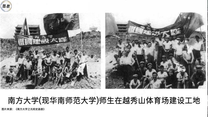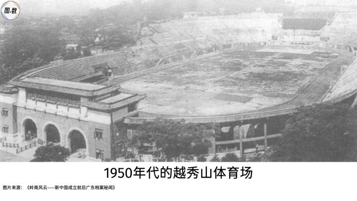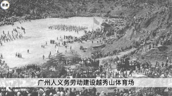 新中国建立后的1950年,一万多名劳动人民在越秀山谷地辛勤劳动,建设新的越秀山体育场。