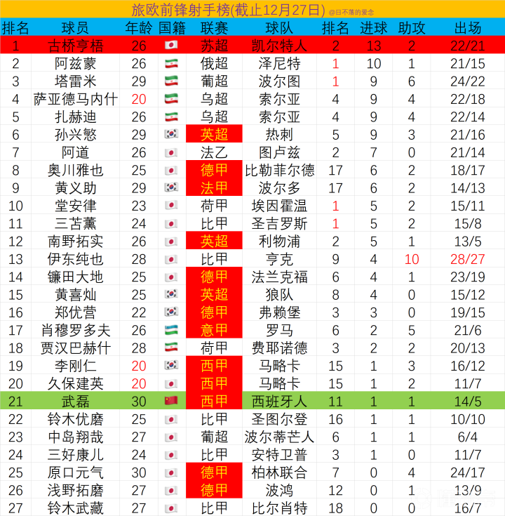 最新旅欧前锋射手榜:古桥亨梧第1,孙兴慜第6,武磊第21 本周亚洲射手在欧罗巴又有出色表现:古桥亨梧决赛梅开二度,带领凯尔特人夺得苏联杯冠军;阿兹蒙当选俄罗斯足球先生;塔雷米、堂安律、三苫薰帮助各自球队排名联赛榜首;南野拓实联赛杯连续3场破门,帮助利物浦杀进四强;20岁小将萨亚德马内什攻入一球,帮助球队客场战平班霸基辅迪纳摩。 不过也有一些球员表现不佳,上赛季攻进17球的铃木优磨,本赛季只进了1球,身披10号战袍的铃木武藏甚至一球未进,也导致球队排名垫底。 ps:如果有重要球员未被统计,欢迎指正