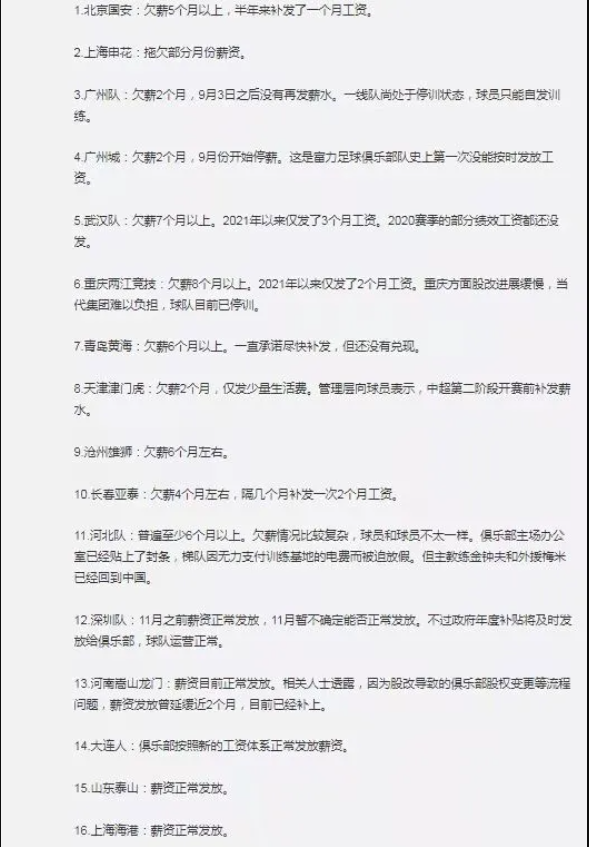 据媒体爆料,中超16队至少有11家存在拖欠薪水的情况,已经有6支球队向足协申请了帮助,称他们已经连基本的路费都拿不起了。有的俱乐部更是传出了只能勉强凑齐11人参赛,甚至还有3支面临破产的球队,虽然中超第二阶段成功重启了,但谁也无法确定俱乐部未来的发展状况。