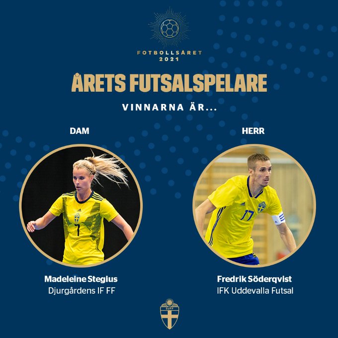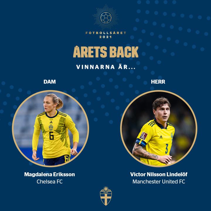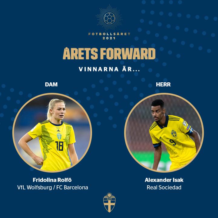 2021年度瑞典足球评选: 男、女足最佳球员:福斯贝里(RB莱比锡)、罗尔法(沃尔夫斯堡女足/巴塞罗那女足) 男、女足最佳前锋:伊萨克(皇家社会)、罗尔法 男、女足最佳中场:福斯贝里、塞格(罗森加德女足) 男、女足最佳后卫:林德洛夫(曼联)、埃里克松(切尔西女足) 男、女足最佳门将:奥尔森(埃弗顿/谢菲尔德联)、林达尔(马德里竞技女足) 男、女足最佳五人制球员:索德奎斯特(乌德瓦拉)、斯特吉乌斯(尤尔加登) 最佳电子足球选手:乌特格伦 男、女足最佳裁判员:库鲁姆、斯帕希奇 足球频道荣誉奖(07年设立,对瑞典足球做出巨大贡献的球员或教练员):罗伊-霍奇森,教练生涯始于瑞典,曾执教哈尔姆斯塔德、奥德沃尔德、奥雷布洛、马尔默 (信息来源:瑞典足协官网 https://svff.svenskfotboll.se/nyheter/2021/12/fotbollsaret-2021---alla-pristagare/)