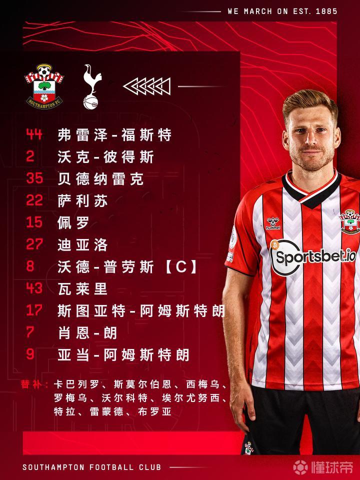 2021/22赛季英超第20轮 | 南安普顿 v...南安普顿足球俱乐部 @懂球帝2021-12-28 22:002021/22赛季英超第20轮 | 南安普顿 vs 热刺 ,我徒首发名单公布! 圣徒首发:弗雷泽-福斯特、沃克-彼得斯、贝德纳雷克、萨利苏、佩罗、迪亚洛、沃德-普劳斯【C】、瓦莱里、斯图亚特-阿姆斯特朗、肖恩-朗、亚当-阿姆斯特朗展开更多