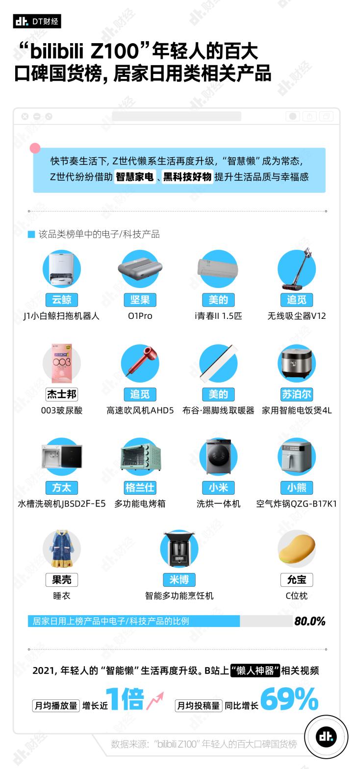 在B站Z100年轻人的百大口碑国货榜中,居家日用类的的高赞物品占据17.6%,其中出现了不少以智能、全自动为主打的产品。比如能完成基础清洁的扫拖一体机,完成清扫的同时又完成了拖地。