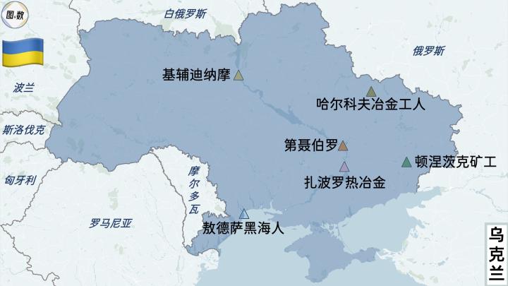 最西面的是敖德萨黑海人足球俱乐部,敖德萨是乌克兰重要的港口城市,有“黑海明珠”之称,“黑海人”(Chornomorets)一词有时也被音译为查诺莫斯。
