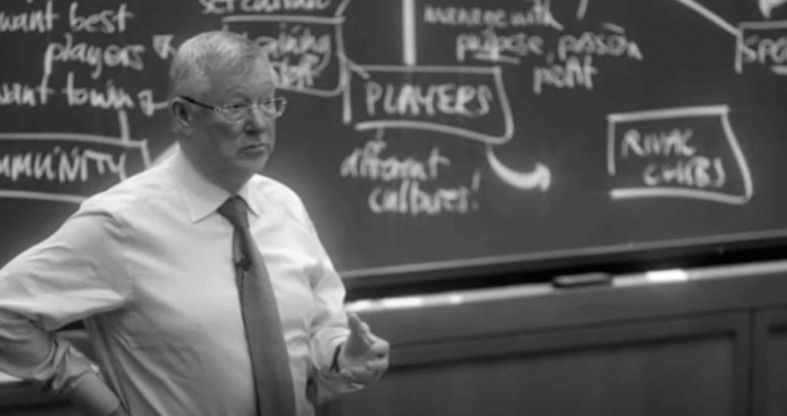咱们继续看哈佛商学院的视频,弗格森回答了一个关于从执教生涯学到了什么“关键知识”的温和问题,我们能看到他在写下的关键词前面与学生们交流,在那块巨大的黑板上,有些地方用方框和下划线做了重点标记。有一处写着“目的,激情,收益”。