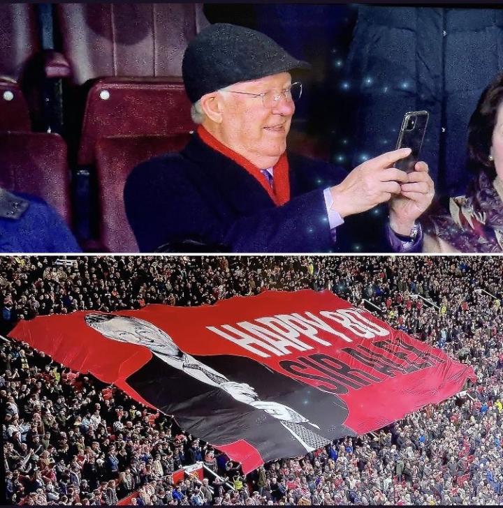 在英超第20轮曼联3-1伯恩利的比赛中,曼联球迷在看台为弗格森爵士展出巨型横幅,弗格森爵士非常开心,并用手机记录这一刻。