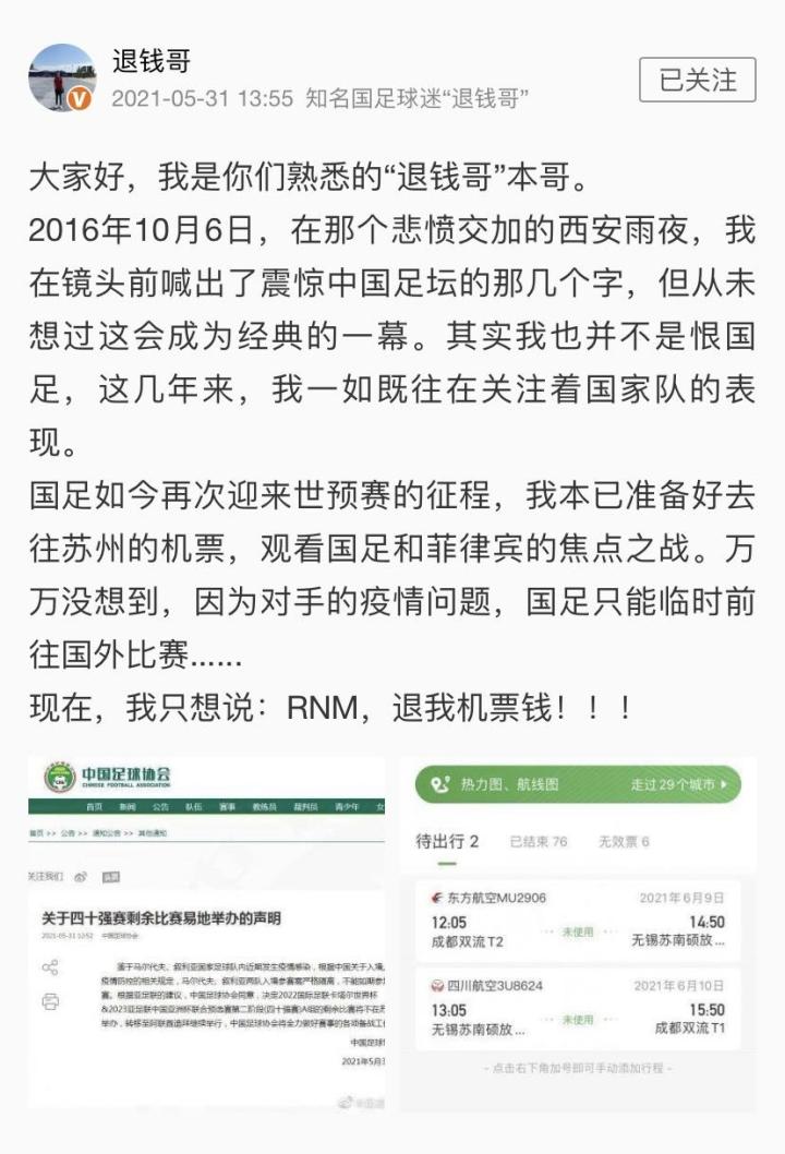 此时此刻,一个难题摆在了万千中国球迷面前。很多人早早请好假,买好机票准备去苏州为国足加油,突然的取消苏州主场让大家叫苦不迭。著名国足球迷"@退钱哥 "在百感交集之中喊出了“RNM,退我机票钱”,无奈而心酸,也唤起了无数球迷对五年前的记忆。