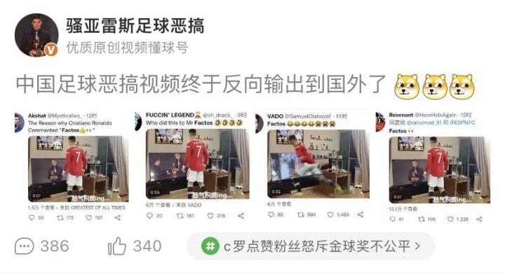 美洲杯似乎是给去年不如意的梅西最好的安慰,凭借着美洲杯上的精彩发挥,梅西赢得了第七座金球奖。在金球奖的评选结果颁布之后,@骚亚雷斯足球恶搞 制作的恶搞视频当C罗看到梅西7获金球奖,从懂球帝火到了外网,C罗本人在社交媒体的一句“Factos”更让这个视频有了些魔幻现实主义的意味。