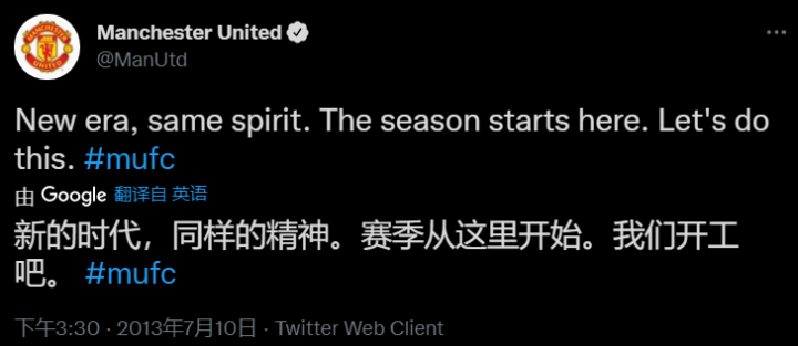 带有曼联胸前赞助商TeamViewer的宣传物料以及关于C罗的视频都是可以预计的社交媒体热门动态。弗格森执教期间拒绝了这样的商业扩张,曼联直至2013年才开始发布推文(下图就是第一条)。据说,弗格森还觉得自打三德子掌权以来,曼联俱乐部过于强调各种赞助商了。