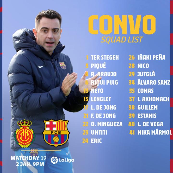 天极血辰由于伤病、停赛和疫情等各方面原因,巴萨在2022年第一场比赛里就面临着多达十五人以上的减员。客战马略卡的大名单中有多达11名B队(指号码超过25号)的球员。其中包括了本赛季一直待在一队的佩尼亚和尼科,在哈维上任后得到机会的尤特格拉,进过几次名单但是机会寥寥的伊利亚斯,桑斯和吉列姆-海梅,以及首次进入一队大名单的科玛斯,佩德罗拉,卢卡斯-德维加和米卡。这次大名单里有很多名字对于一般球迷来说都非常陌生,所以在大名单出来之后我决定火速加更一篇,给大家介绍一下这些球员。其中在一队机会较多的球员我会写得比较简略,主要介绍大家不太熟悉的名字。