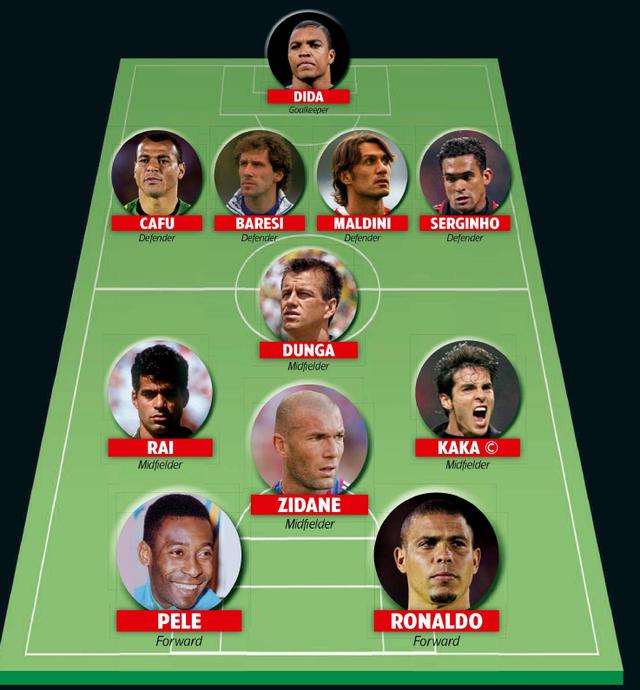 2007年卡卡在接受《世界足球》杂志采访时选出的梦之队:迪达/卡福、巴雷西、马尔蒂尼、塞尔吉尼奥/邓加、拉易、齐达内、卡卡/贝利、罗纳尔多。