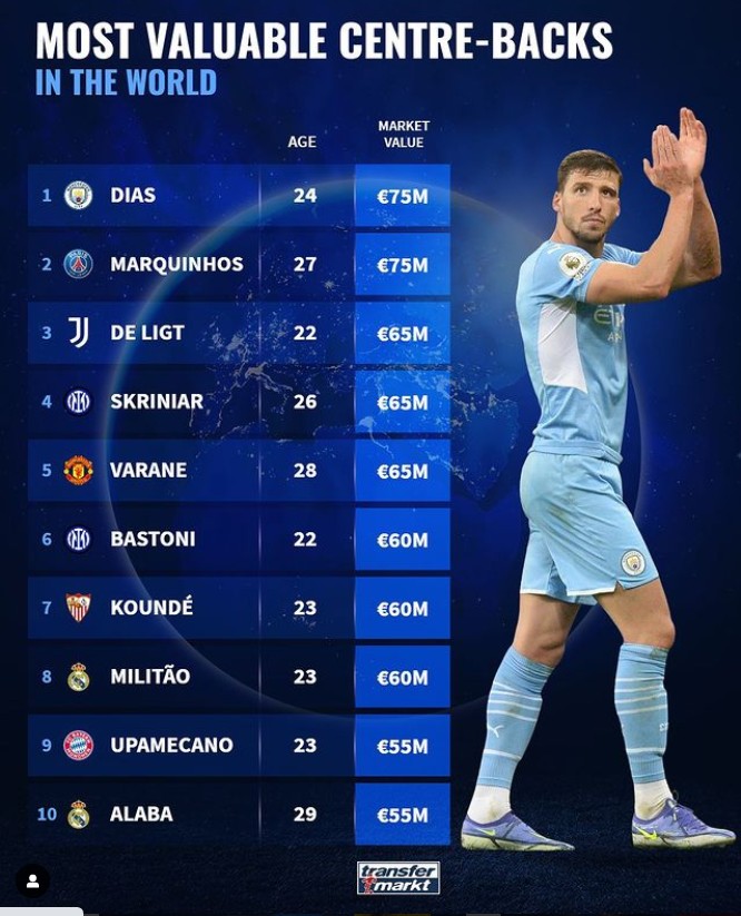 德国转会市场更新中卫身价榜,鲁本-迪亚斯和马尔基尼奥斯以7500万并列榜首,德利赫特和瓦拉内紧随其后。