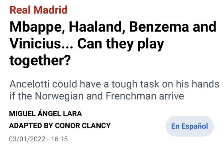 由这4位球员组成的锋线似乎是“乌托邦式”的,很难想象安切洛蒂会用什么方式让他们发挥作用。但可以肯定的是,如果姆巴佩和哈兰德都来到伯纳乌的话,他们几乎会一直上场比赛。因此,安切洛蒂必须要找到一种让球队攻守平衡,且让进攻组合发挥作用方法。