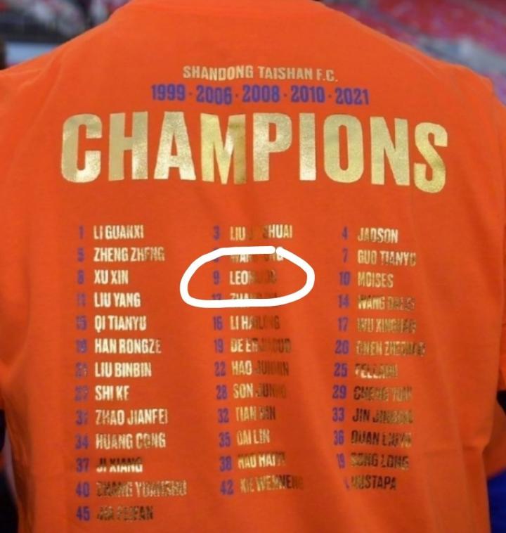 夺冠不忘外租球员,泰山队冠军衫上写着莱昂纳多的名字